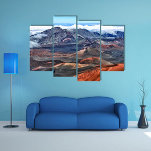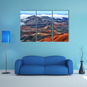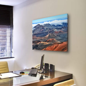 Experience the serene beauty of Haleakala Volcano in this stunning canvas wall art. Featuring an aerial view of volcanic craters and mountains, this piece showcases a vibrant palette of red, brown, and blue, evoking a dramatic and vast atmosphere.