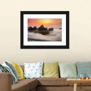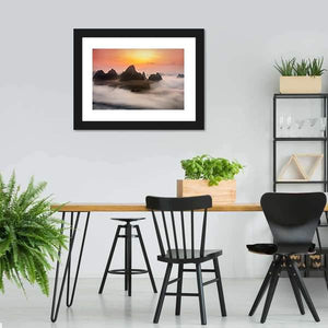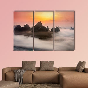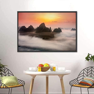China Karst Mountains Canvas Wall Art shows misty karst peaks and low sun as clouds roll around the mountain bases, captured in a nature photography style. Soft orange and pink light over grey peaks gives a serene, ethereal yet dramatic mood that suits modern living rooms or bedrooms.