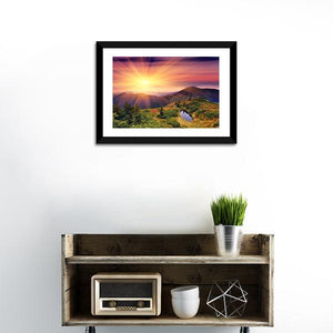 A landscape of dawn over mountain peaks and a small mountain lake, with sun rays piercing a purple-pink sunset sky. The calm, dramatic scene—rich in blues, purples, greens, and oranges—fits modern living spaces or offices that want nature-inspired wall art.