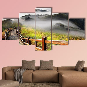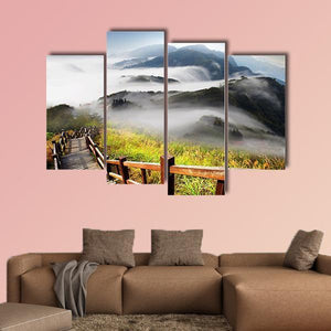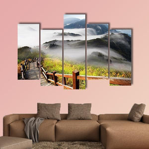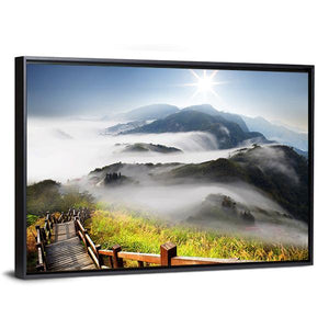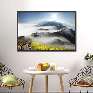 A realistic landscape photo of a mountain range and a sea of clouds, with a wooden walkway and railing leading through lush green grass toward the peaks. Sunlight breaks through the clouds, creating a serene, majestic, and tranquil mood that fits modern or nature-inspired room decor.
