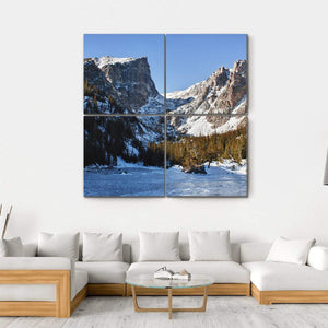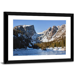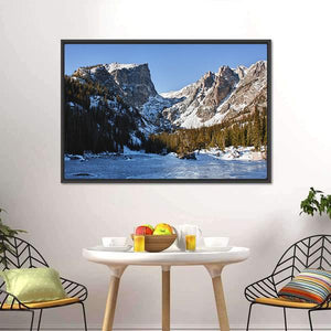 Capture the serene beauty of Emerald Lake with this canvas art featuring snow-capped mountains, pine trees, and a frozen lake. The tranquil scene, enhanced by glimmering sunlight on the snow and a clear blue sky, brings a touch of nature's majesty into your space.