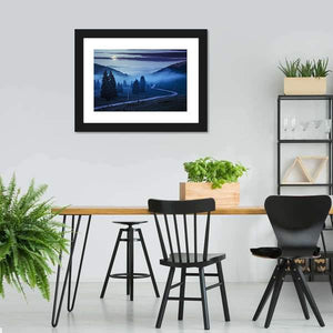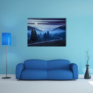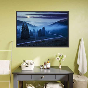 A moonlit forest scene with a winding road through a foggy valley, pine trees, and mist‑shrouded mountains beneath a visible full moon. The atmospheric composition uses depth and the rule of thirds to create a serene, mysterious mood that fits modern or nature-inspired rooms.