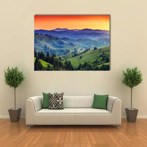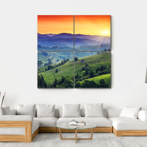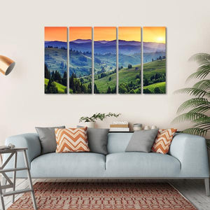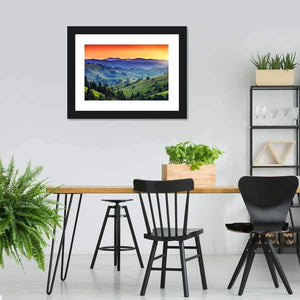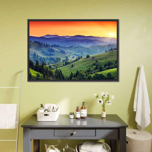 This landscape artwork features rolling hills and a majestic mountain range, bathed in a serene sunset sky. The vibrant colors of green, blue, and orange create an atmospheric scene that brings nature indoors.