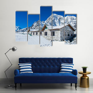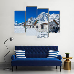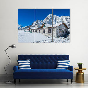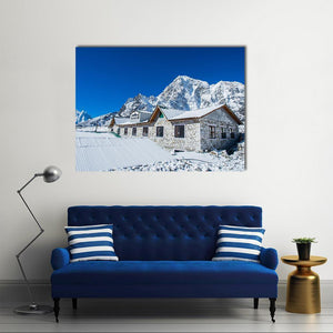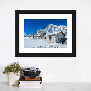 Everest Base Camp Canvas Wall Art depicts a row of stone buildings with dark windows and snow-covered corrugated roofs beneath jagged, snow-capped peaks and a clear blue sky. The photorealistic scene reads as serene, majestic, and cold. It pairs well with modern room decor or mountain-inspired interiors.