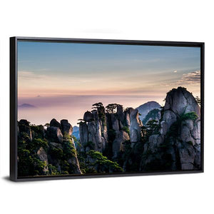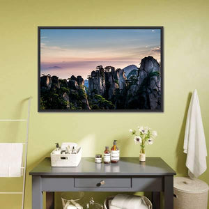 Huangshan Mountain in Anhui captures rocky peaks and pine trees clinging to sheer faces beneath a soft morning or evening sky, photographed with a rule-of-thirds composition. The muted greens, grays, blues and warm pink-orange light create a serene, majestic, peaceful atmosphere that suits modern interiors and living rooms.