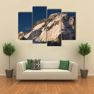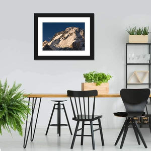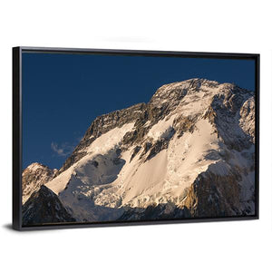 K2 Broad Peak Mountain Canvas Wall Art presents a close-up, low-angle view of a snow-capped peak and rocky slopes beneath a clear blue sky. Dramatic lighting — sunlight on the ridges and deep shadows defining the terrain — gives the scene a majestic, serene, and awe-inspiring mood. This epic nature photograph suits modern or minimalist living spaces that need a calm, vast focal point.