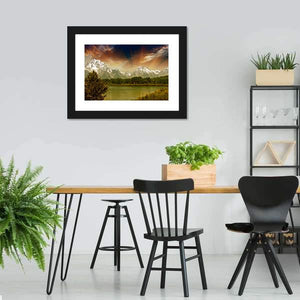 Experience the majestic beauty of Grand Teton National Park with this canvas wall art. Depicting snow-capped mountains and vibrant sunbeams breaking through the clouds, it brings a serene yet dramatic atmosphere to any space.