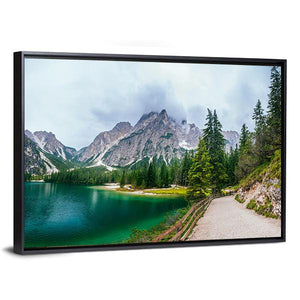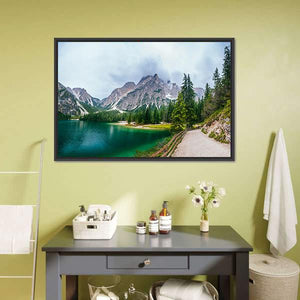 A serene mountain lake scene with snow-capped peaks, pine trees, and a walking path beside a wooden fence. The layered composition and cool blues, greens, grays, and whites draw the eye to the lake’s reflection and convey a calm, majestic mood. Pairs well with modern or nature-inspired room decor.