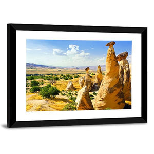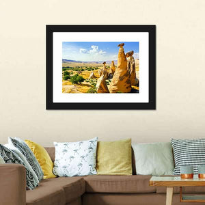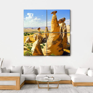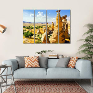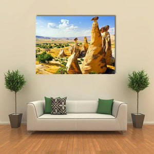 This canvas art features enchanting fairy chimneys and striking rock formations set against a vast valley, capturing a serene summer day. The palette of yellow, brown, blue, and green brings a sense of tranquility to any space.