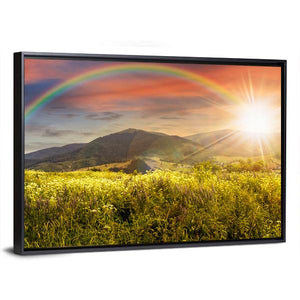 A realistic panoramic canvas depicting mountains, a field of flowers, a sunburst with radiating rays, and a vibrant rainbow arc. The warm yellow, green, blue, orange, and red palette creates a hopeful, serene, and vibrant atmosphere. Suited to modern or nature‑inspired rooms as a colorful landscape accent.