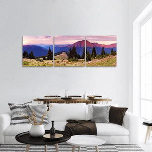 This panoramic canvas captures mountain peaks, tree-lined valleys and a wide sky bathed in late-afternoon sunset light. Rendered in blues, pinks, greens and soft purples with layered, realistic depth, it creates a serene, majestic atmosphere that suits modern living rooms or nature-focused spaces.
