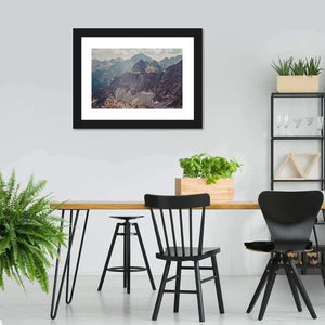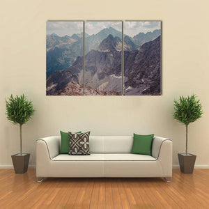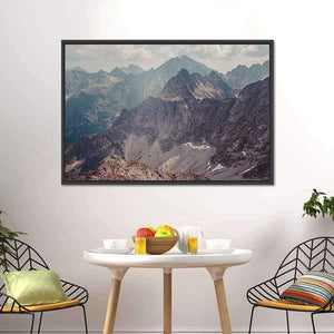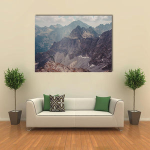 Mountain Landscape In Tatras captures a jagged mountain range in muted grays and blues, with rocky peaks, snow patches and sunlight breaking through a cloudy sky. The dramatic perspective and sharp rock formations convey a majestic, rugged calm well suited to modern living rooms and home interiors.