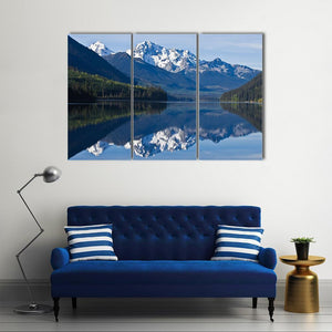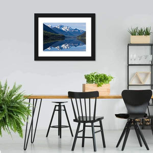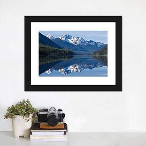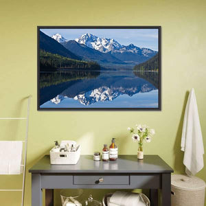 This beautiful canvas showcases snow-capped mountains, a lush pine forest, and a tranquil lake with a stunning reflection. Its serene and majestic atmosphere makes it a lovely addition to any nature-inspired décor.