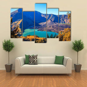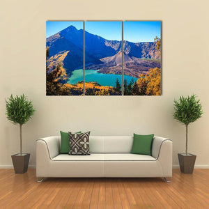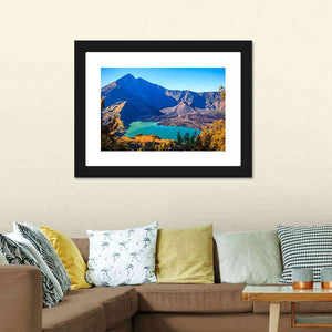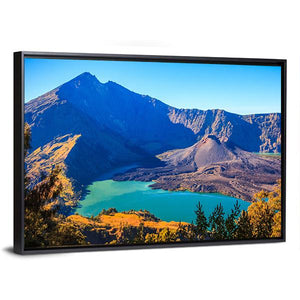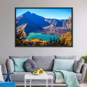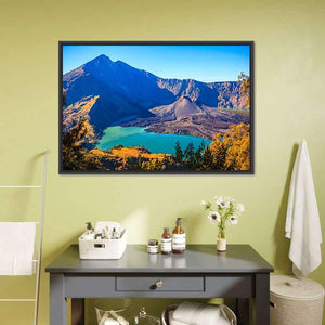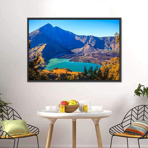 This canvas shows Mount Rinjani with its turquoise crater lake and volcanic cone from a wide, aerial perspective. The realistic landscape feels serene and majestic, and it suits modern or nature-focused rooms.