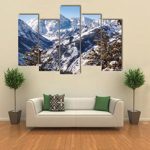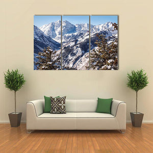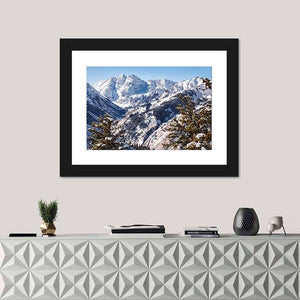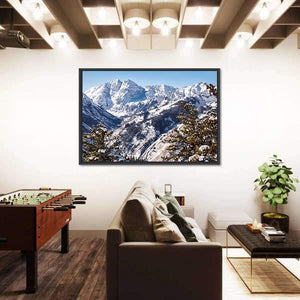 This stunning canvas art captures the majestic snowy mountains and serene valley, complemented by pine trees and a bright blue sky. Its realistic style and cool color palette of white, blue, green, and brown create a calming ambiance for any space.
