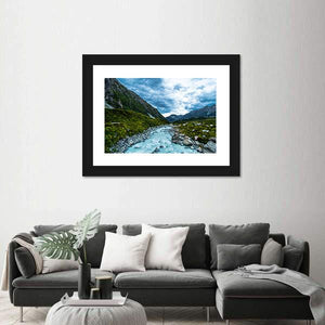This Mt Cook & Hook Valley canvas captures a wild mountain river cutting through rocky riverbeds and lush green slopes beneath a cloudy sky. The composition emphasizes depth and the rule of thirds, creating a dramatic yet serene, powerful atmosphere that fits modern or nature-themed rooms.