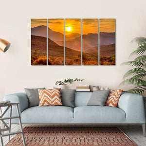 This canvas art captures a serene sunset behind majestic mountains, creating a warm and tranquil atmosphere. The hazy sky features rich shades of orange, yellow, and purple, adding depth and texture to your space.