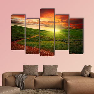 Featuring a winding mountain path through rolling hills, this canvas captures a sunset-lit meadow with a clear sunburst effect. The rule-of-thirds composition and warm greens, oranges, reds, and browns give the scene a dramatic, summery mood. It suits modern home decor or room settings that favor nature-inspired artwork.