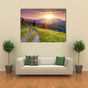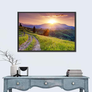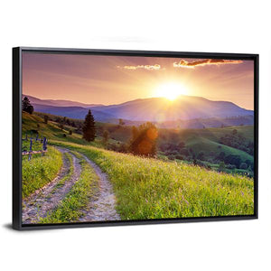 This canvas art captures a serene mountain path winding through rolling hills at sunset. With its warm hues of green, gold, and purple, it brings a peaceful touch of nature to any space.