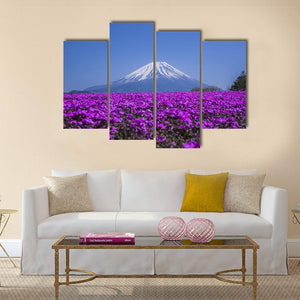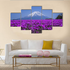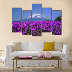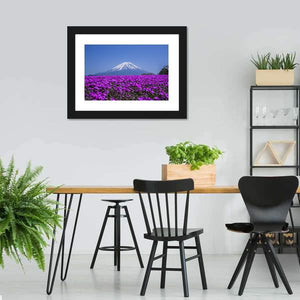 This canvas art features a serene view of Mount Fuji surrounded by a vibrant field of purple flowers. The harmonious palette of blue, white, and green invites a picturesque atmosphere to any space.