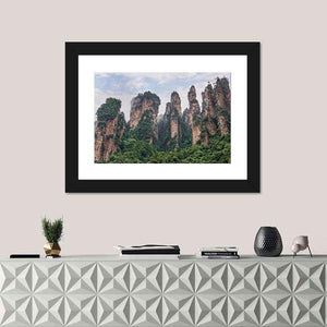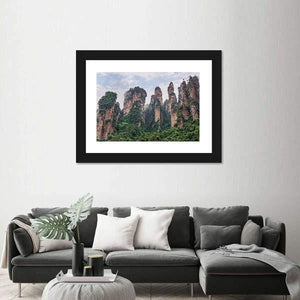 This artwork captures the majestic pillars of Zhangjiajie, framed by lush green trees and a misty sky. Its serene atmosphere invites a sense of calm and wonder, making it a perfect addition to any nature lover's space.