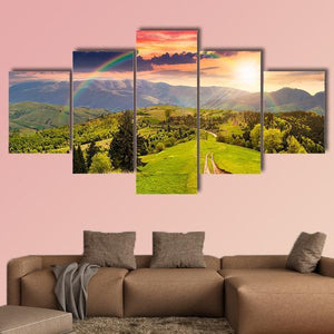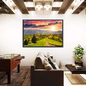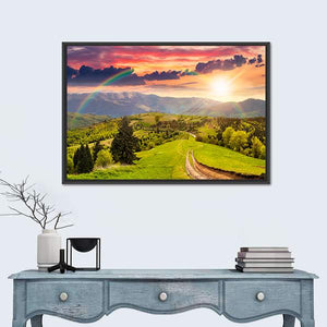 A landscape canvas showing pine trees beside a dirt road winding through a meadow toward rolling hills and distant mountains, with a sunset rainbow overhead. Sunbeams and soft clouds give a peaceful, vibrant, majestic late-afternoon feeling. Works well in nature-inspired or rustic home living spaces and warm modern rooms.