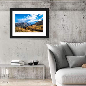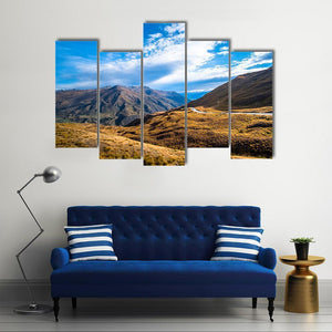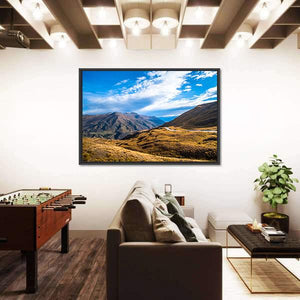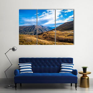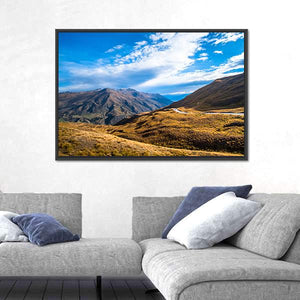 This canvas shows the road between Queenstown and Wanaka along the Crown Range, with layered mountains, dry yellow grass in the foreground, and puffy white clouds overhead. The daytime, sunny autumn scene reads calm and vast, with blue skies and warm browns and yellows. Suits nature-focused rooms and either rustic or modern interiors seeking a peaceful landscape focal point.