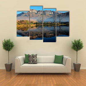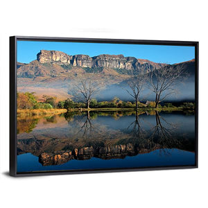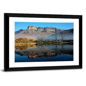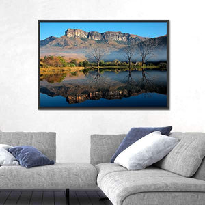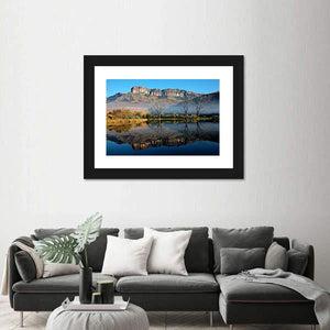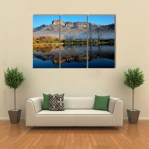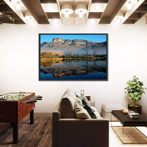 A realistic landscape of a sandstone mountain range and a still lake, with layered peaks and bare trees reflected in calm water. A clear blue sky and a palette of blue, brown, green and white create a serene, majestic, tranquil mood. Suited to modern or nature-inspired rooms and house decor.