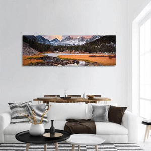 Siberian Mountain At Sunset captures snow-capped peaks and a calm lake in a serene, majestic panorama. Pine-fringed grassland, a rocky shore and warm orange sunset tones reflect across the water for layered depth. It pairs well with modern or nature-focused rooms.