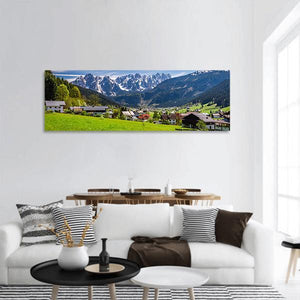 This panoramic canvas shows the small village of Gosau in the Austrian Alps, set among green hills and snow-capped mountains. Rendered in a realistic, naturalistic style with green, blue, white and brown tones, it brings a peaceful, scenic, idyllic atmosphere that suits modern or nature-inspired interiors.