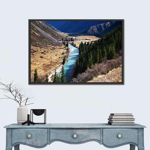 Tyan Shan Mountains Panoramic Canvas captures a winding river through a mountain valley of dense evergreen forest and dry, grassy hillsides in a realistic, wide-angle composition. Cool blues, greens and brown tones give the scene a serene, vast, peaceful mood. Works well in modern or nature-inspired rooms as a calm focal piece.