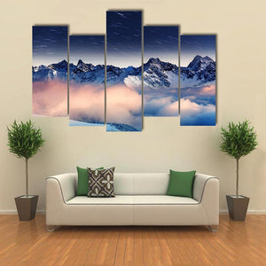 Snow-capped mountains rest beneath a wide-angle Milky Way night sky, with star trails and pink-tinged clouds creating an ethereal scene. The photorealistic, dramatic image in blue, white, pink and black gives a serene, majestic mood that suits modern home room décor.
