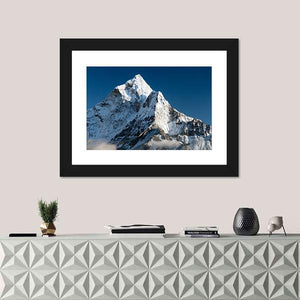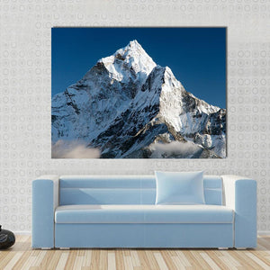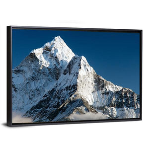 This canvas print captures the majestic beauty of Mount Ama Dablam in Nepal, showcasing a full view of its sharp peak surrounded by textured snow and clouds. The serene palette of blue, white, gray, and black evokes a sense of cold tranquility, making it a perfect addition to your landscape art collection.