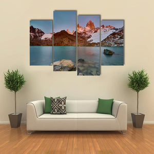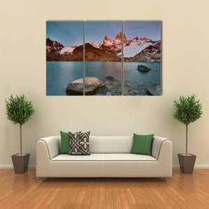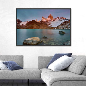 View Of Mount Fitzroy During Sunrise shows snow-capped peaks, calm lake water and large boulders in a realistic landscape. Soft blues, browns, whites and pinks give the scene a serene, majestic, peaceful dawn mood that suits modern homes and room decor.