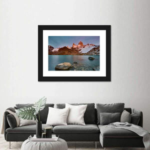 Mount Fitzroy Sunrise Panoramic Canvas presents a photorealistic view of a snow‑topped mountain range and a quiet lake at dawn, with a rock in the water and sharp peaks lit by soft pink and blue light. The piece feels serene and majestic, and its natural palette works well in modern or nature‑inspired rooms as a calm focal point.