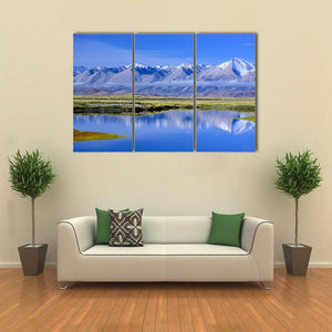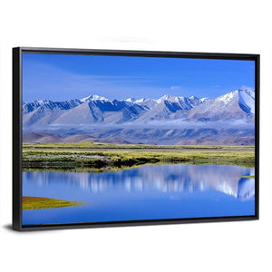 This canvas depicts snow-capped Zhongba Mountains with a calm lake that reflects the clear blue sky and surrounding grasslands. Rendered in a realistic, scenic style with blue, white, green and grey tones, it offers a serene, vast mood that fits modern home decor.