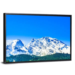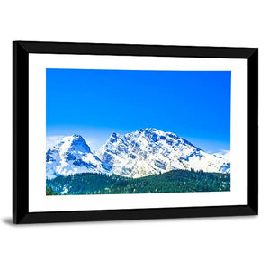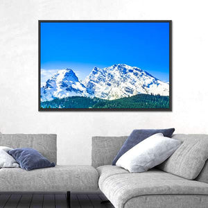 Photorealistic view of Watzmann’s snow-capped peaks and a dense pine forest beneath a clear blue sky, with crisp snow texture and a serene, majestic feeling. The vast, calm scene works well in modern or nature-inspired rooms as wall art.