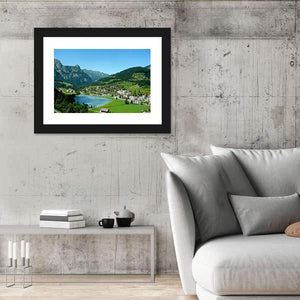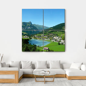 Experience the serene beauty of Engelberg, Switzerland, with this captivating canvas art. The scene features a tranquil lake, charming village, and majestic snow-capped mountains, evoking a peaceful atmosphere perfect for any room.