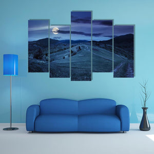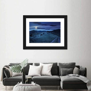 A moonlit mountain landscape that shows a village beside a forest, rolling hills, and a winding mountain path under a cloudy sky and full moon. Rendered realistically in blues, purples, greys and white, the scene feels serene and mystical and suits modern or nature-inspired rooms.