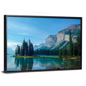 This canvas art features a serene lake surrounded by majestic mountains and coniferous trees. The tranquil scene, highlighted by a clear blue sky and reflective waters, brings a peaceful vibe to your space.
