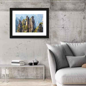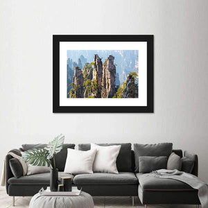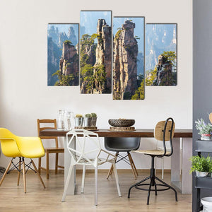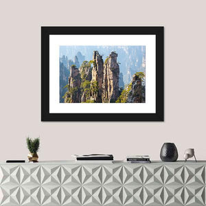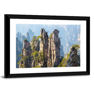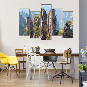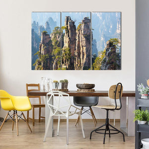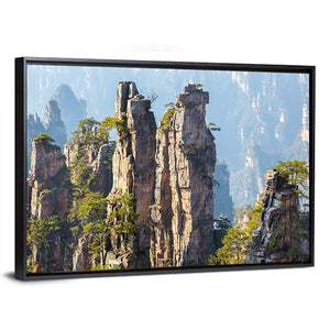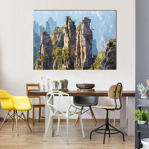 This canvas artwork showcases the majestic beauty of Zhangjiajie Forest Park in China. Featuring tall rock formations framed by lush trees and misty mountains, it offers a serene atmosphere that brings nature indoors.