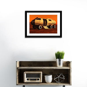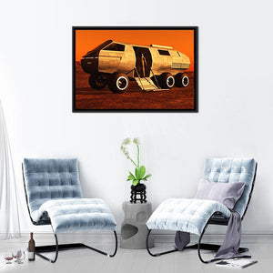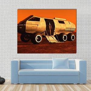 This canvas art features an astronaut exploring the Martian landscape in a six-wheeled rover. The sci-fi vibe and vibrant orange and black palette create a sense of futuristic adventure, making it an intriguing addition to any space.