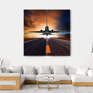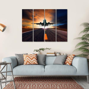 This canvas art captures an airplane taking off, showcasing the thrilling moment against a vibrant sunset sky. The dramatic use of orange and blue hues adds depth and energy, making it a striking addition to any space.