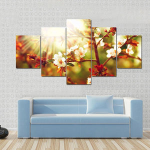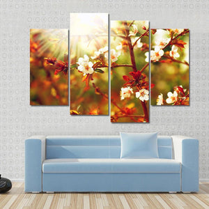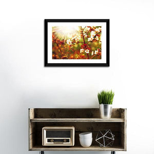 This canvas art captures the beauty of flowering branches bathed in warm sunlight. With delicate petals and vibrant red leaves, it brings a serene and peaceful touch to any space.