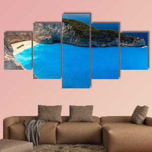 Navagio Beach Canvas Wall Art shows a high-angle view of a cliffed coastline with a blue sea, sandy beach and the shipwreck on shore. The realistic scene feels serene and dramatic, with blue, white, green and tan tones that create a picturesque atmosphere. It fits coastal or modern room decor as a calm, scenic focal point.