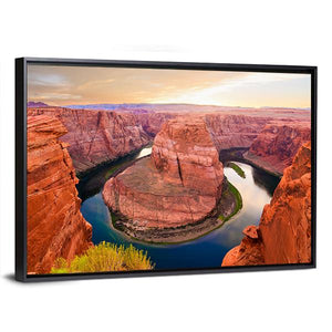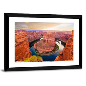 This beautiful canvas features the breathtaking view of Horseshoe Bend, showcasing the winding Colorado River surrounded by majestic canyon rock formations. The warm sunset sky, filled with rich reds, oranges, and yellows, creates a serene atmosphere that brings the beauty of nature into your space.
