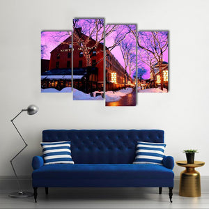 Capture the charm of a snowy nighttime in the city with this landscape canvas of Faneuil Hall Marketplace. Featuring the North Market sign and twinkling lights, it's a festive addition to your wall decor.