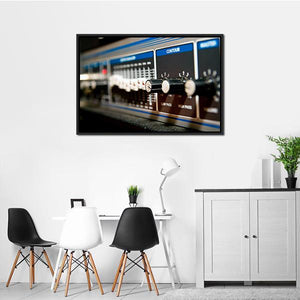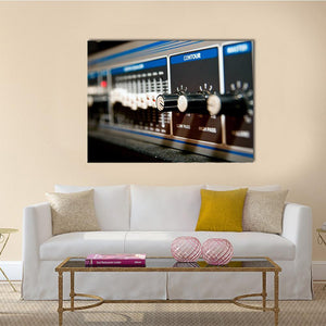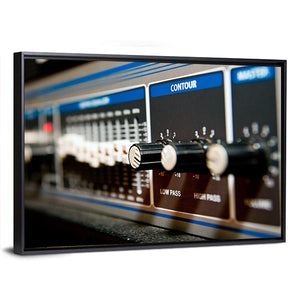 A close-up study of audio equipment—knobs, sliders and labeled controls like CONTOUR, LOW PASS and HIGH PASS are shown with shallow depth of field. Rendered in cool tones of blue, black, white and silver, the image reads as technical and precise, a natural fit for modern music rooms or contemporary living spaces.