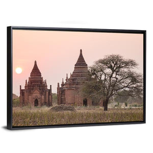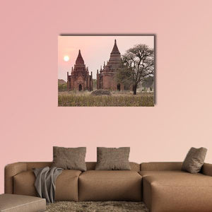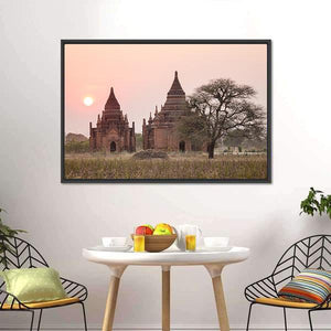 A realistic landscape print of two ancient brick Buddhist temples in Myanmar at sunset. Warm earth tones of orange, yellow and brown fall across a field and a large deciduous tree, creating a serene, peaceful, historical atmosphere that suits modern room decor and living rooms.
