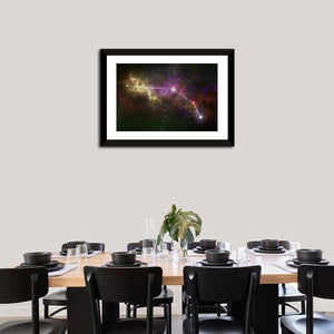 Aries Constellation Canvas Wall Art shows the Aries constellation traced with connecting lines among glowing nebula clouds and scattered stars. The purple, yellow, white, red and black palette gives the piece a cosmic, ethereal, majestic mood. With an abstract, modern feel, it suits contemporary living rooms or bedrooms as focused wall decor.